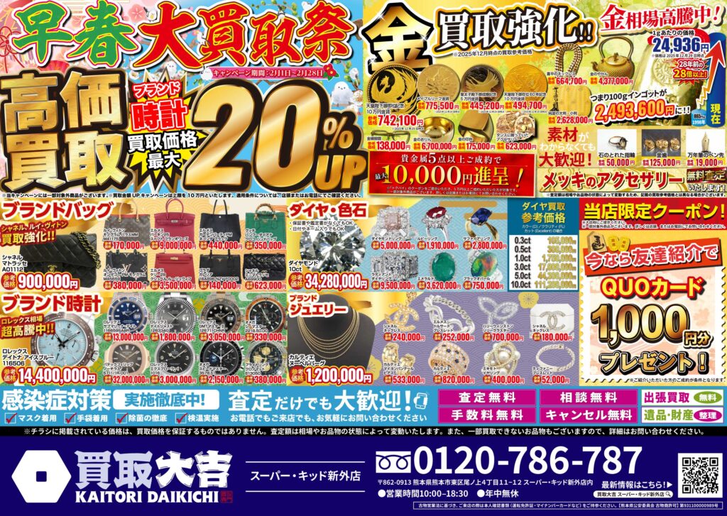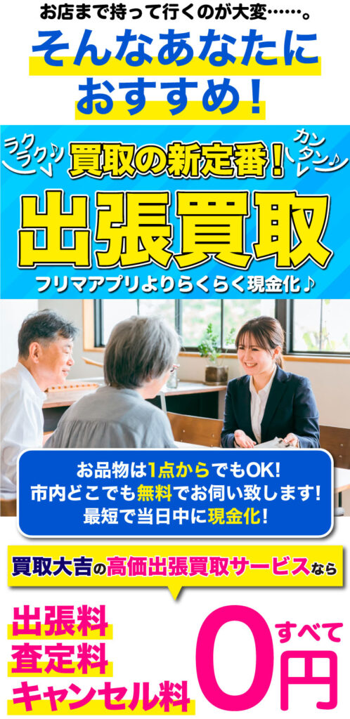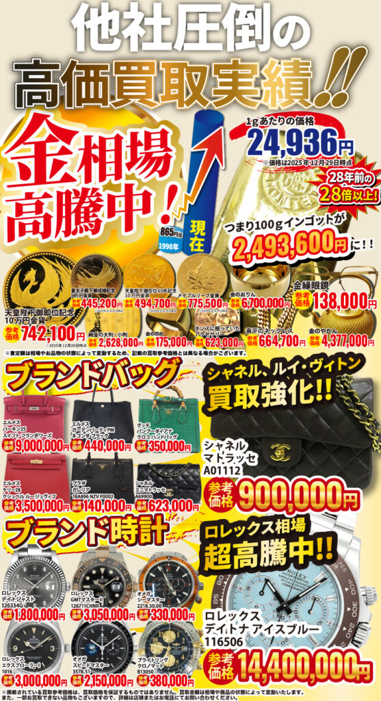 キャンペーン実施店舗 よくあるご質問 買取価格は主にどんな要素から決まるのでしょうか? お品物の状態や付属品の有無、最新相場、流通量などによって買取価格を算出します。 どんなものを買い取ってもらえますか? 金・貴金属・ブランド品はもちろん、お値段がつくか迷われているものも是非お持ちください。 傷や汚れのあるアイテムでも買取可能ですか? 大歓迎です。未使用品などのお持ち込みは少なく、傷や汚れのあるアイテムをお持ちいただく方が半数以上です。状態の悪いお品物やカビなどがあってもお買取可能なケースもございます。 どんな情報があればすぐに査定額を教えてもらえますか? お品物の名前や種類、状態、またはブランド名、型番などの情報があると、概ねの査定額をお伝えできるかと思います。 店舗での査定時間はどのくらいですか? お品物の種類や個数にもよりますが、約5分から30分ほどの査定時間となるケースが多いです。事前にある程度の査定時間をお伝えいたしますので、ご安心ください。